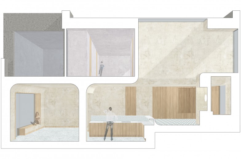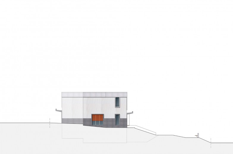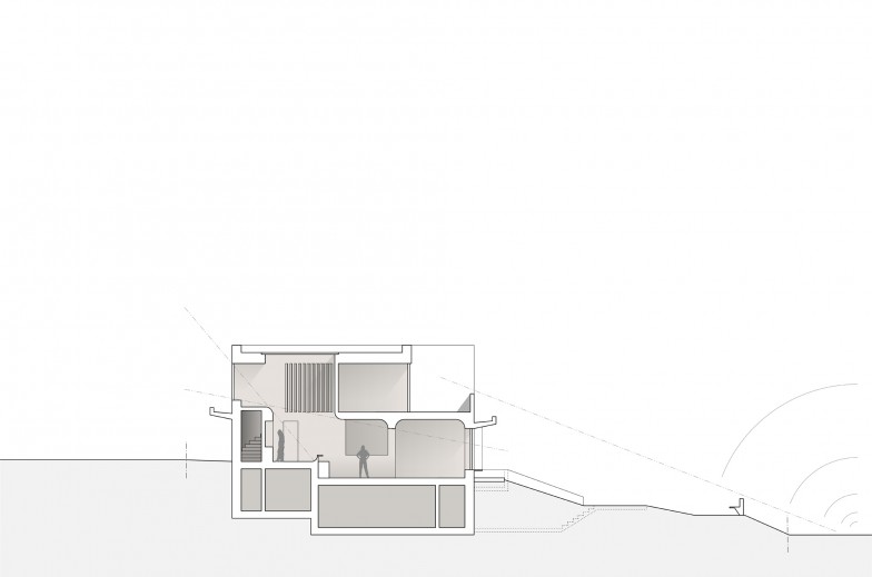 Im Erdgeschoss sind die Wohnräume in zusammenhängende Bereiche gegliedert, welche dem Terrainverlauf folgen. Das zonierte Raumkontinuum wird mit einer Licht und Blickkanone angereichert, welche ein subtiles Spiel von Licht und Schatten in den Wohnraum trägt und den Blickbezug zum Goldenberg herstellt. Der eher niedrige Eingang kontrastiert mit dem hohen Wohnessbereich.