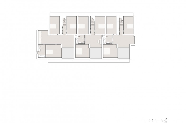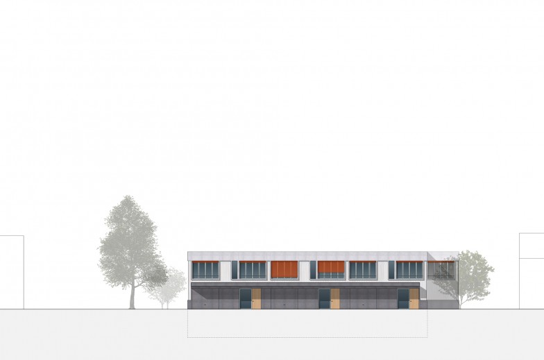 Eine Loggia im Obergeschoss erlaubt es, alle Räume natürlich zu belüften und die Grenzwerte der Lärmimmissionen durch die Bahn gut einzuhalten.