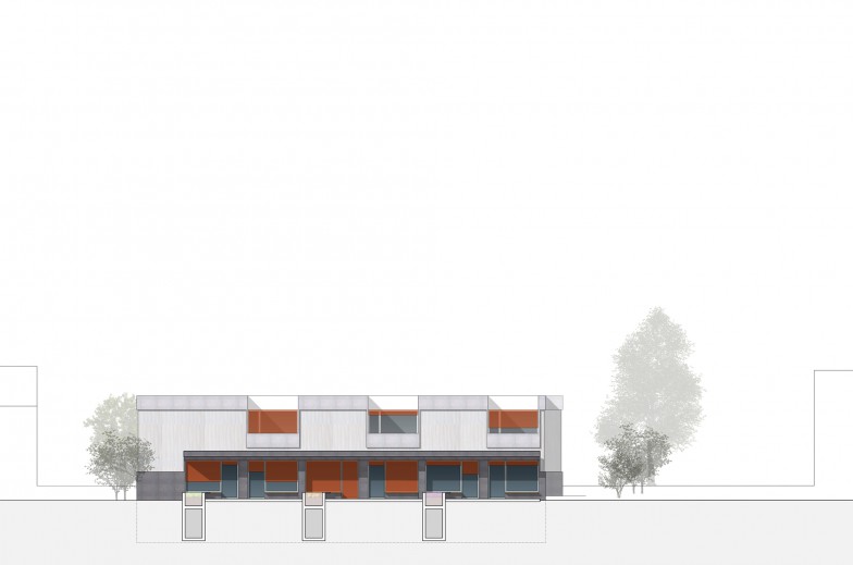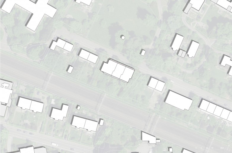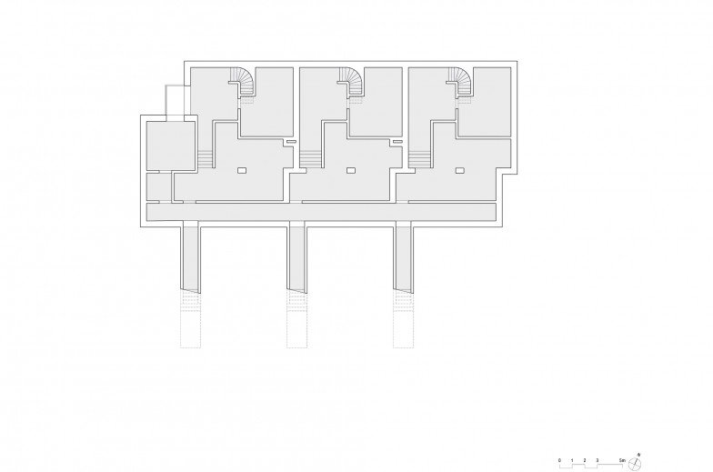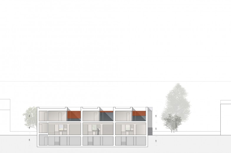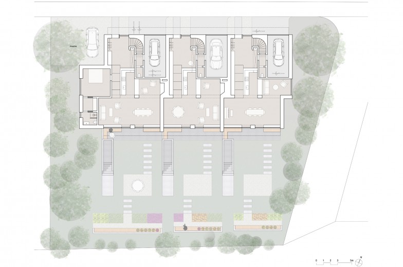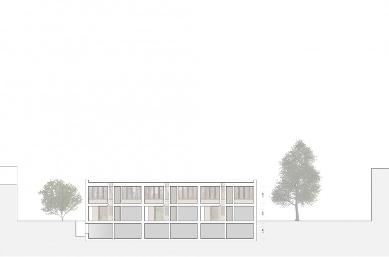 Der präzise gesetzte Baukörper führt den streng definierten Strassenraum der Leimeneggstrasse konsequent weiter und stärkt so die Ausnahmestellung des ehemaligen Kutscherhauses. Im kompakten Baukörper sind drei Wohneinheiten als Reihenhäuser mit integrierter Parkierung organisiert.