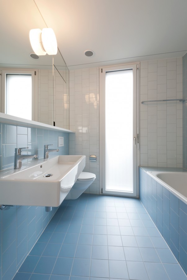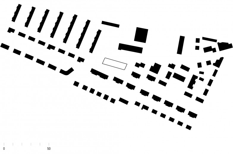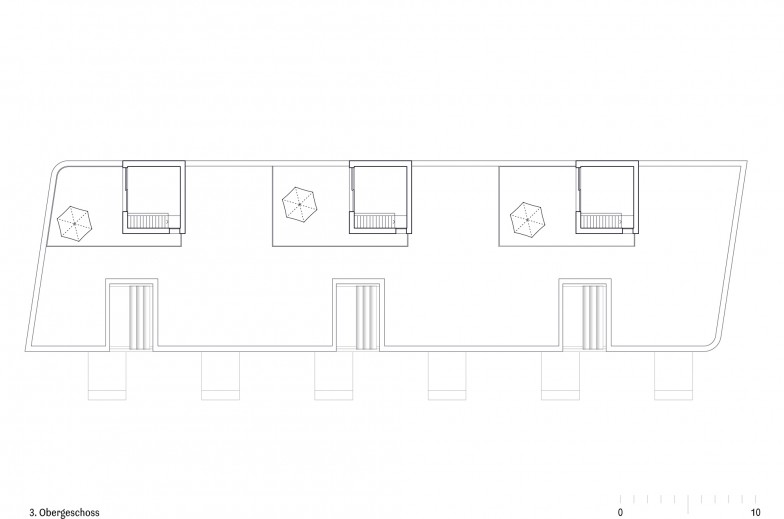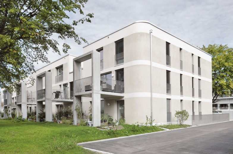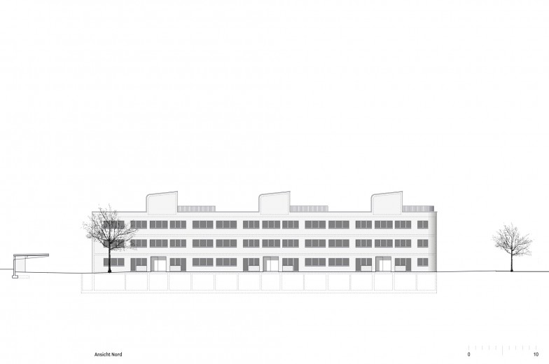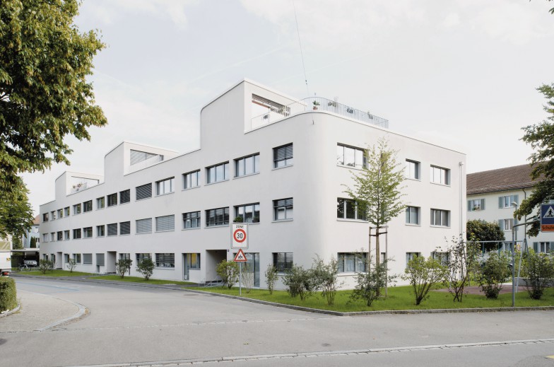 Parallelen prägen das Bebauungsmuster im nordwestlichen Siedlungsgebiet von Winterthur. Das Volumen dreht sich subtil aus der vorherrschenden Orthogonalität aus und akzentuiert damit sowohl seine Grundrissform als auch seine Position zwischen den Wohnbauten und dem benachbarten Schulhaus.