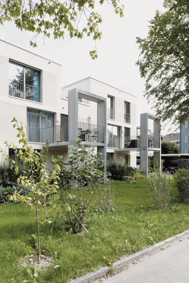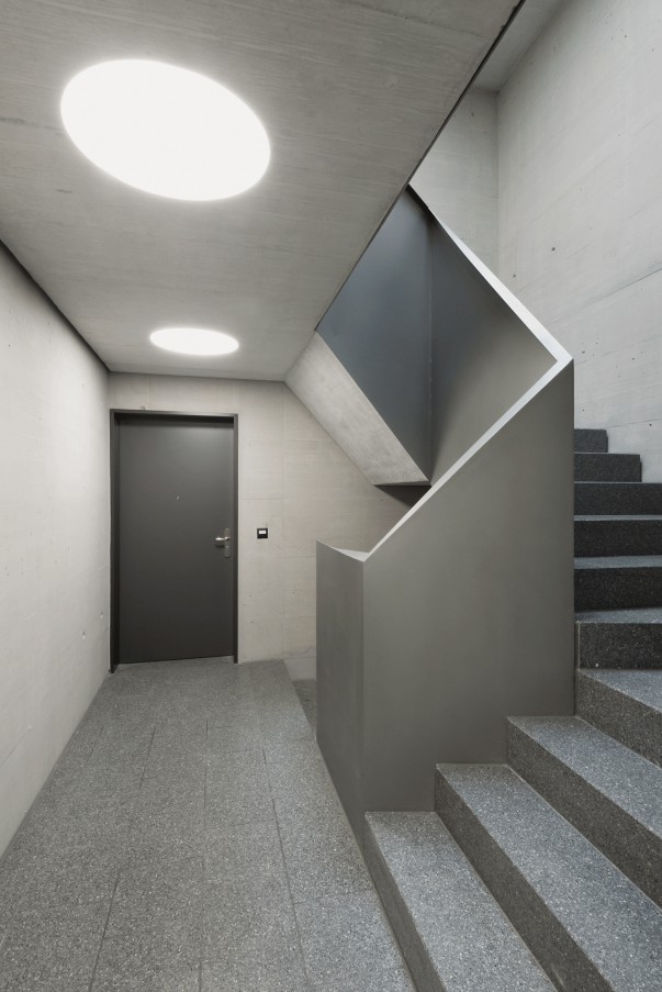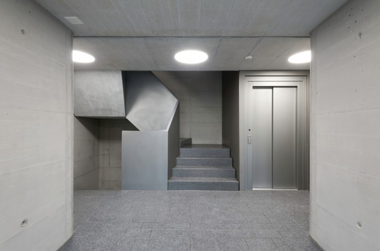 Die kubische Grundform wird durch Erhöhungen, Einschnitte und Auskragungen modelliert und erhält damit auf vier Ebenen grosszügige private Aussenräume. Zwei abgerundete Gebäudeecken fassen die spezifisch ausformulierten Strassen- und Hoffassaden zu „Halbschalen“ zusammen, welche sich zu einer neuen, dipolaren Einheit fügen.