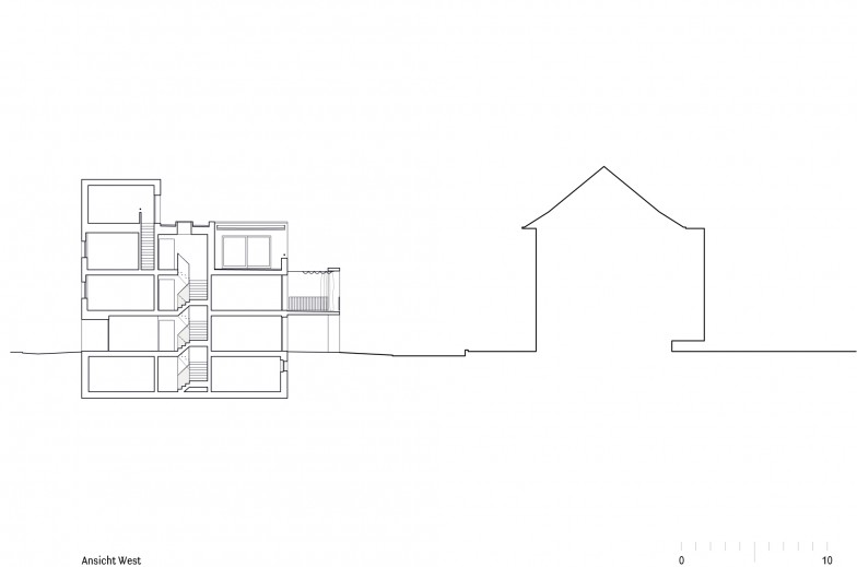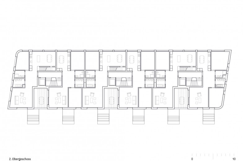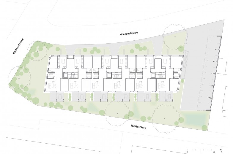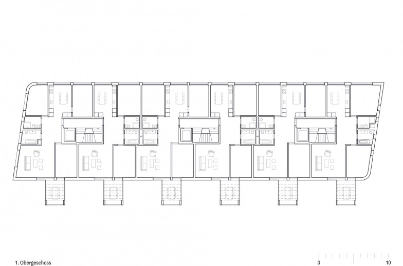Der Neubau im Quartier Veltheim fasst zwei Wohnbau-Typologien der Umgebung in einem Baukörper zusammen. An der Nahtstelle zwischen Reihenhaussiedlungen aus den 20er- und Genossenschafts-wohnblöcken aus den 50-er Jahren, verbindet das Mehrfamilienhaus deren volumetrische und strukturelle Charaktere zu einer neuen Ausdrucksform. Es verknüpft typische Reihenhausqualitäten mit der Logik effizienter Geschosswohnungen und reagiert dabei sowohl im Schnitt als auch im Grundriss auf Kontext und Orientierung.